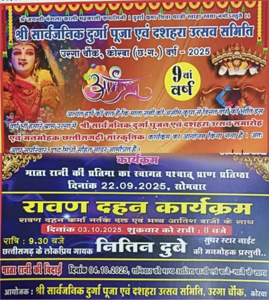 कोरबा जिले के ग्राम पंचायत उरगा में इस बार दशहरा का आयोजन बेहद खास होने जा रहा है। दुर्गा समिति उरगा द्वारा आयोजित यह भव्य कार्यक्रम ग्राम के मुख्य बाजार के पास आयोजित किया जाएगा। इसमें रायगढ़ के राजा का आगमन होगा छत्तीसगढ़ के सुप्रसिद्ध गायक नितिन दुबे अपनी शानदार प्रस्तुति देंगे।