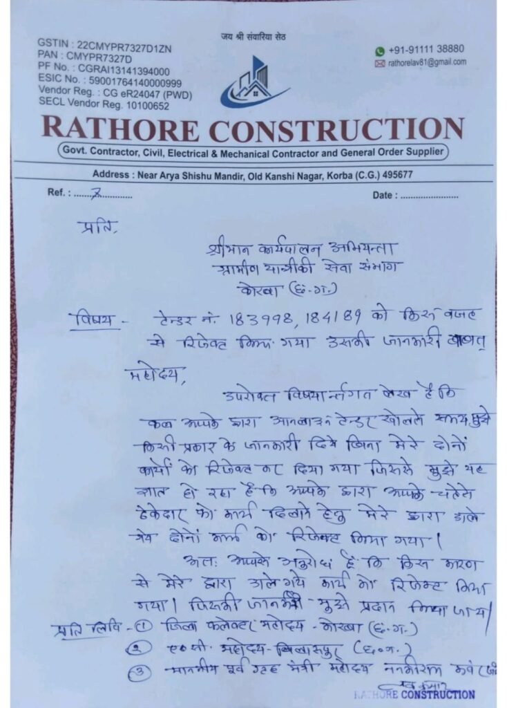शहर की प्रतिष्ठित निर्माण फर्म राठौर कंस्ट्रक्शन ने ग्रामीण यांत्रिकी सेवा संभाग (RES) कोरबा की निविदा प्रक्रिया पर गंभीर सवाल खड़े किए हैं। फर्म के संचालक ने राजगामार प्रयोगशाला से संबंधित जोनल टेंडर में धांधली और अपारदर्शिता का आरोप लगाते हुए कार्यपालन अभियंता को पत्र लिखकर जवाब मांगा है।बिना कारण बताए राठौर कंस्ट्रक्शन के टेंडर हुए रिजेक्टमामला राजगामार प्रयोगशाला के अंतर्गत आने वाले जोनल टेंडर क्रमांक 183998 और 184189 से जुड़ा है। राठौर कंस्ट्रक्शन का कहना है कि उन्होंने नियमानुसार इन कार्यों के लिए अपनी निविदाएं प्रस्तुत की थीं, लेकिन विभाग द्वारा निविदा खोलने के दौरान उन्हें बिना किसी पूर्व सूचना या तकनीकी कारण बताए प्रक्रिया से बाहर कर दिया गया।”चहेते ठेकेदारों को लाभ पहुँचाने का खेल”राठौर कंस्ट्रक्शन ने अपने पत्र में तीखे शब्दों का प्रयोग करते हुए आरोप लगाया है कि विभाग ने अपने “चहेते ठेकेदारों” को अनुचित लाभ पहुँचाने और उन्हें कार्य दिलाने के उद्देश्य से ही उनके दोनों टेंडरों को जानबूझकर रिजेक्ट किया है। फर्म का दावा है कि उनके पास सभी जरूरी अर्हताएं होने के बावजूद उन्हें जानकारी दिए बिना यह कार्रवाई की गई, जो पूरी तरह से नियम विरुद्ध है।कलेक्टर और पूर्व गृह मंत्री तक पहुँचा मामलाइस कथित पक्षपात के विरोध में राठौर कंस्ट्रक्शन ने अपनी शिकायत की प्रतिलिपि जिले के उच्चाधिकारियों और जनप्रतिनिधियों को भेजकर निष्पक्ष जांच की मांग की है। मामले की जानकारी इन्हें भेजी गई है:राठौर कंस्ट्रक्शन ने विभाग से मांग की है कि उन्हें लिखित में यह स्पष्ट किया जाए कि आखिर किन तकनीकी या कानूनी आधारों पर उनके द्वारा डाले गए कार्यों को रिजेक्ट किया गया। जोनल टेंडर जैसे महत्वपूर्ण कार्यों में इस तरह के आरोपों से विभाग की कार्यप्रणाली पर सवालिया निशान लग गया है।